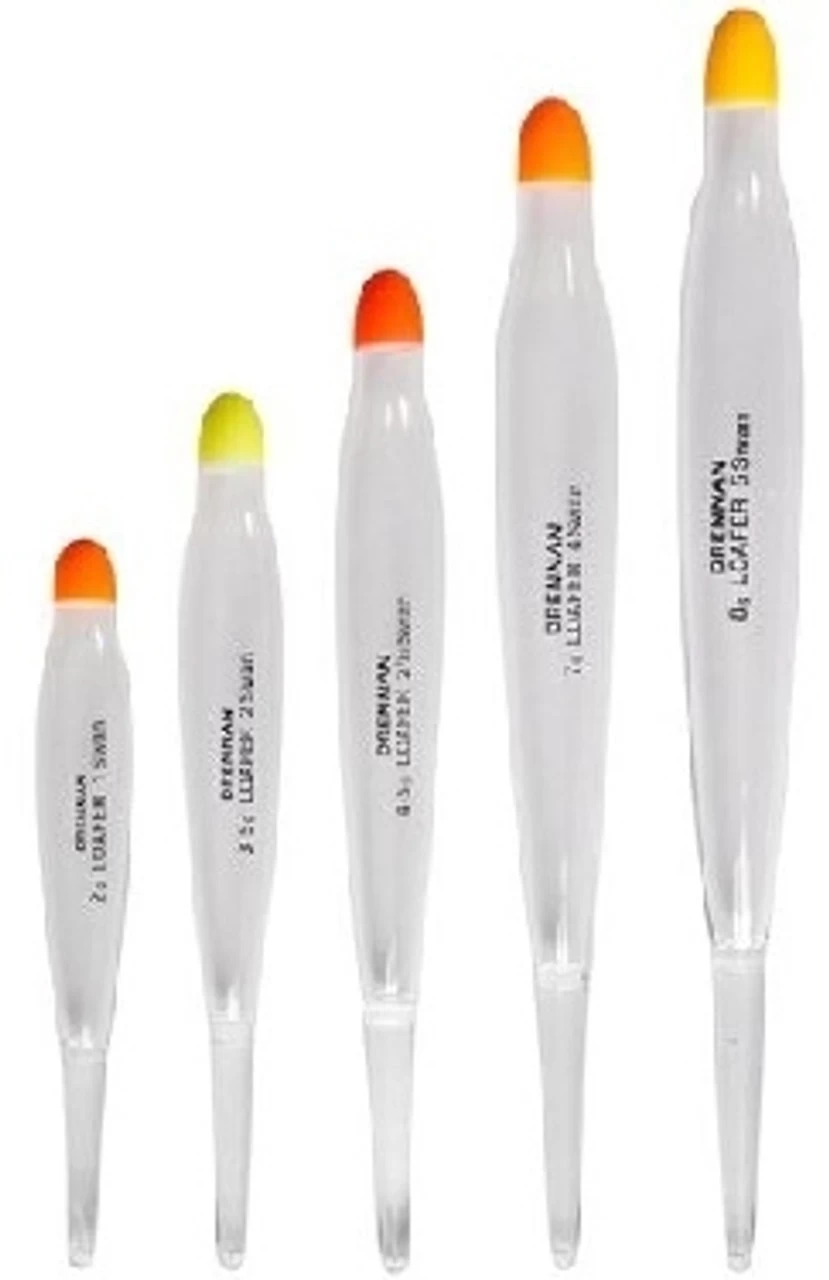 One of the most popular and versatile floats available in a blow moulded plastic. They are light, buoyant and extremely tough. Being clear, they are unobtrusive and are used on rivers and lakes for everything from trotting bread, maggot etc through to fishing small fish baits for perch. We offer five sizes of the Drennan Loafer: 2.4, 3.2, 4.0, 6.4 and 8.0grams.