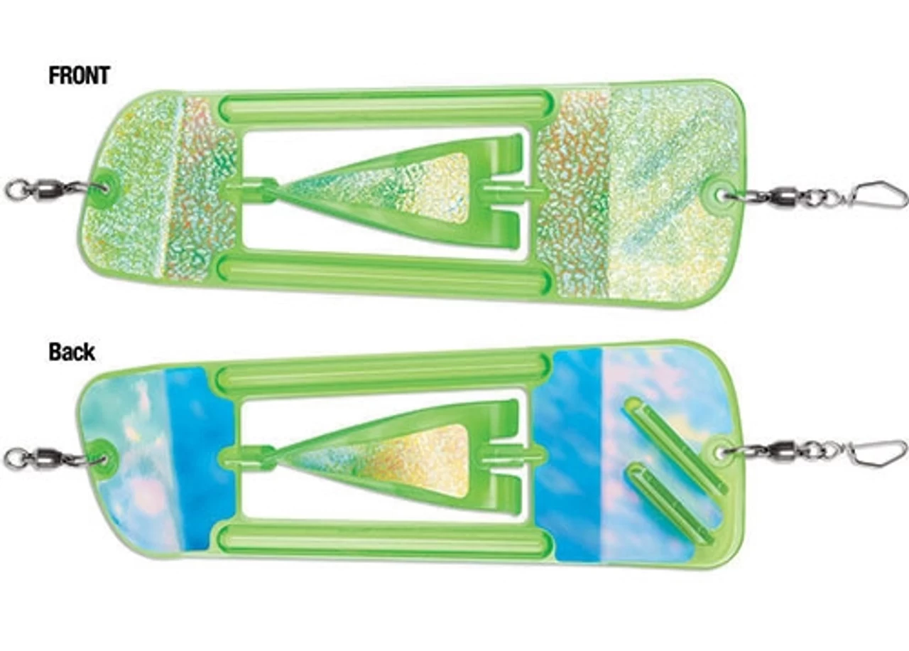 The Coyote Cyclone Flasher is an easy pulling, fully rotating flasher. The flasher rolls in a wide elliptical pattern imparting fish attracting flash and motion to your presentation. The center “Cyclone” blade rotates independently adding a strobing flash and vibration. The Kick-Fin design keeps the flasher rolling over a wide range of speeds.