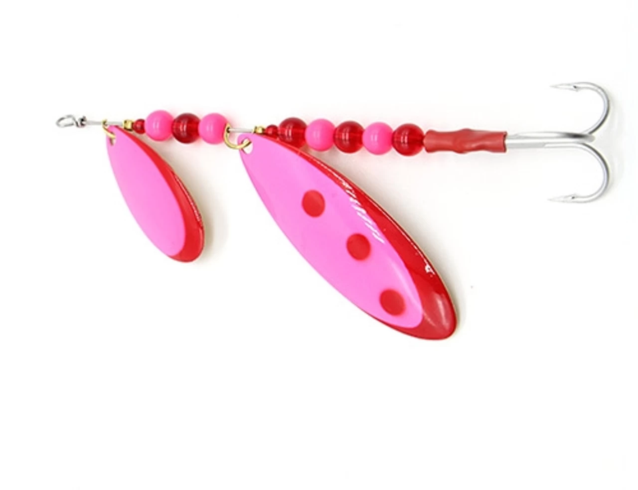 The Tidewater Twin was inspired by the Silvertron, a double-bladed spinner popularized by Sacramento River salmon anglers. Two blades of slightly different profiles create a unique flash and action. PCT took the design of the original Silvertron, listened to serious anglers about it, and modified it accordingly. They have improved blade spin with brass bearing beads, created fish-attracting color patterns, used machined acrylic beads wherever possible instead of molded styrene, and included hook tubing. The blades are polished to a high luster and are treated with a UV clear-coat.