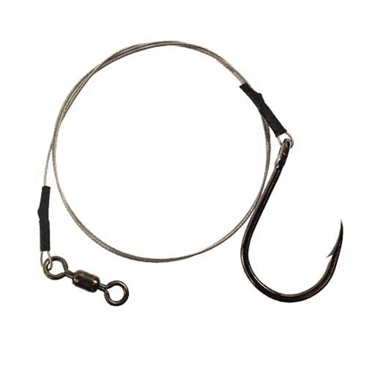Rigging Guide: On your main line (from the fishing rod) place a plastic weight slider onto the line. Tie your main line to the open end of the swivel, attach your lead weight to the plastic slider and your bait to the hook. Cast out and hold on tight!